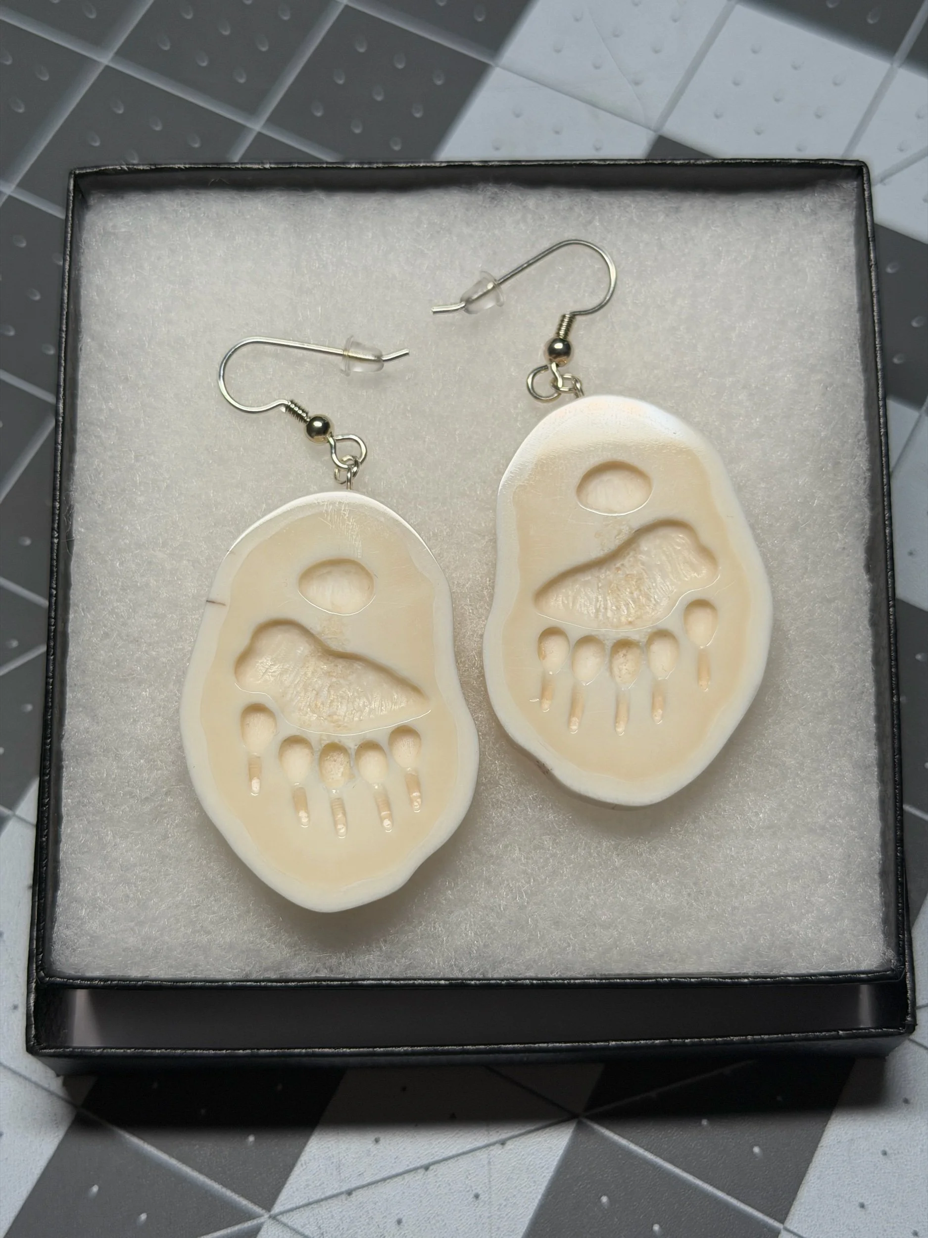 Hand-carved bear print earrings made from natural cut walrus ivory. Slightly thicker in profile to highlight the depth of the carving. Finished with Argentium silver findings for long-lasting brightness and durability.