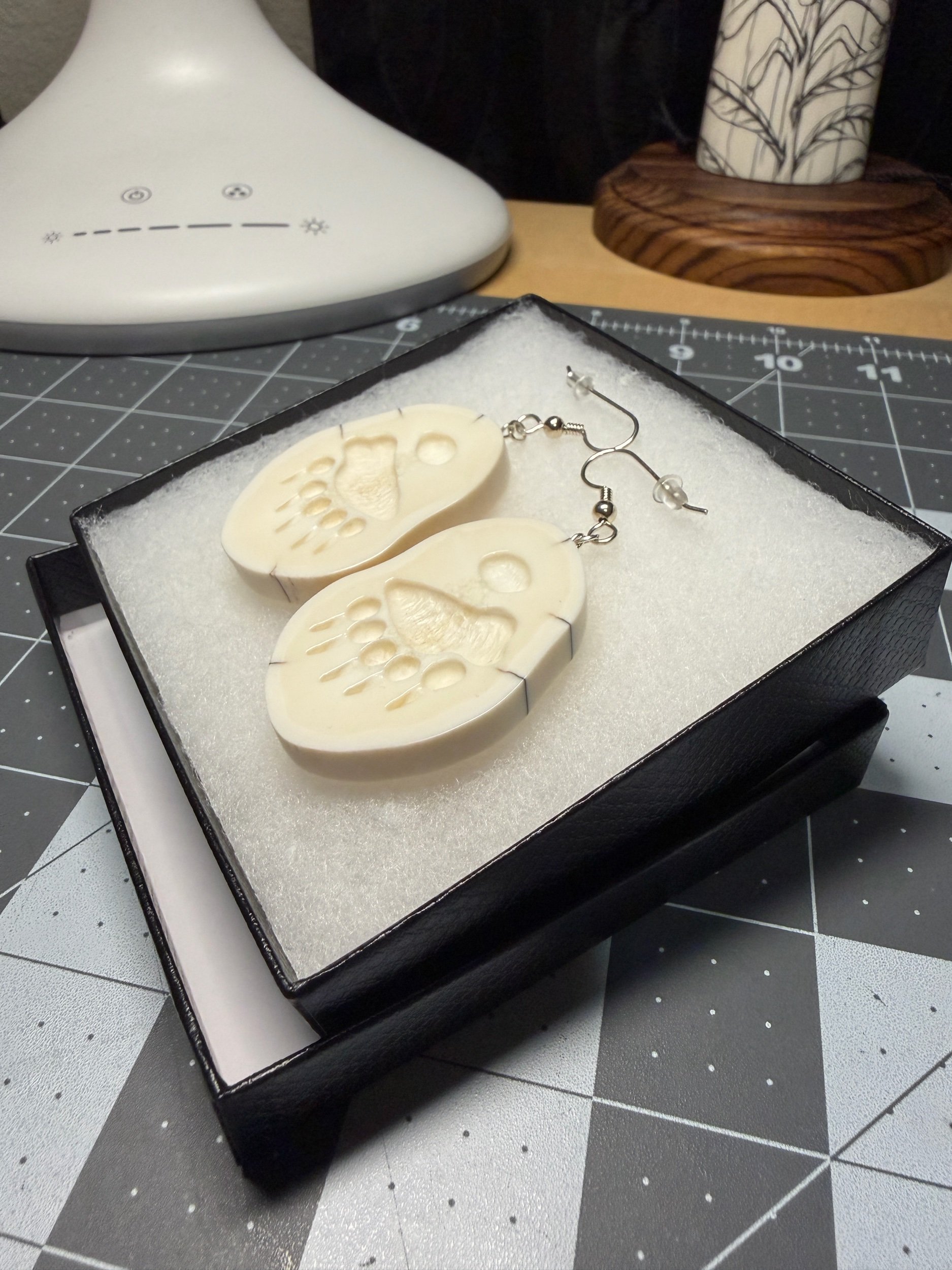 Hand-carved bear print earrings made from natural cut walrus ivory. Slightly thicker in profile to highlight the depth of the carving. Finished with Argentium silver findings for long-lasting brightness and durability.