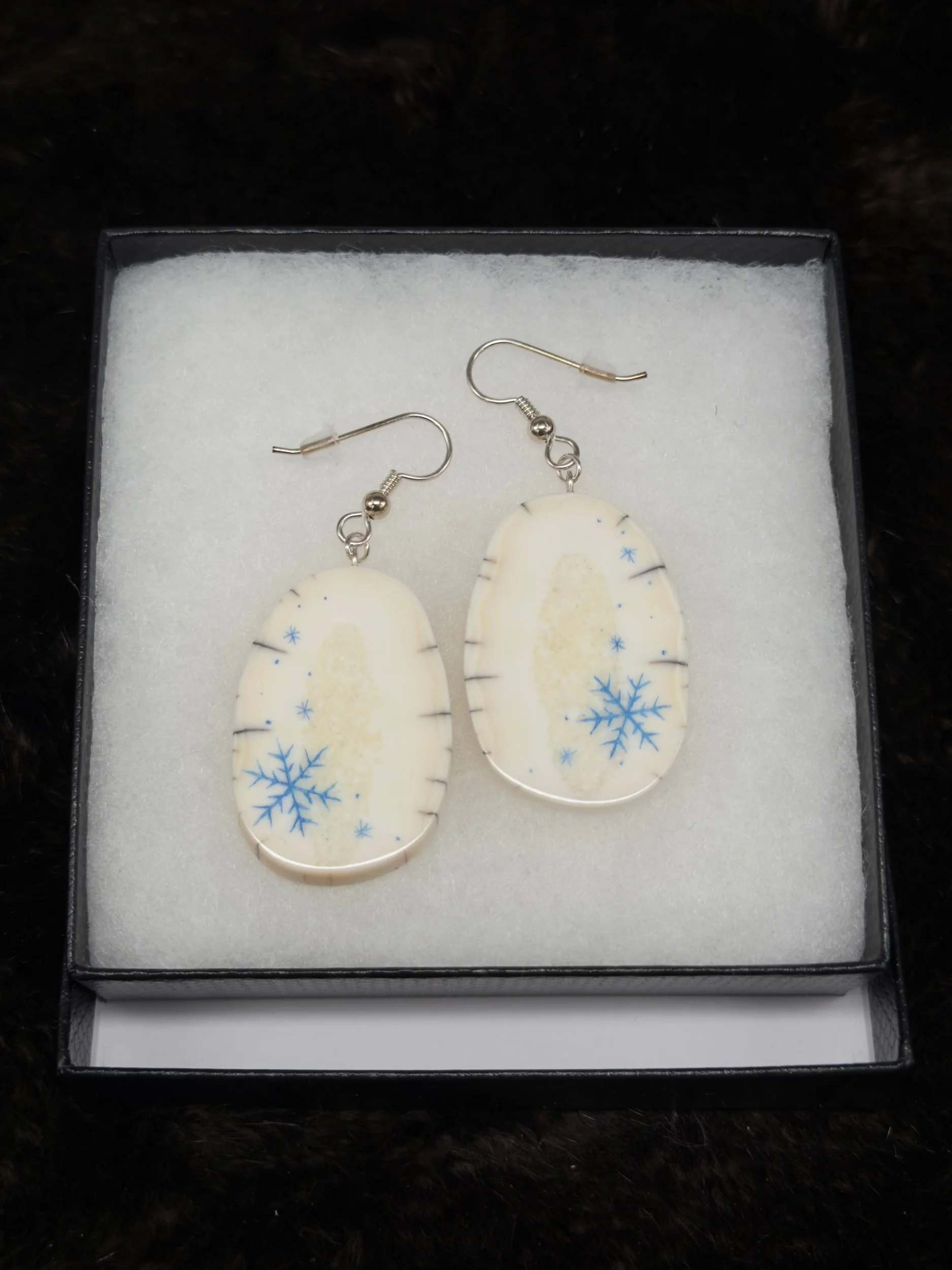 Natural cross-cut walrus ivory earrings featuring hand-engraved snowflake designs, carefully filled with oil-based pigments. The natural grain and subtle color variation in the ivory make each pair one of a kind. Finished with Argentium silver findings.